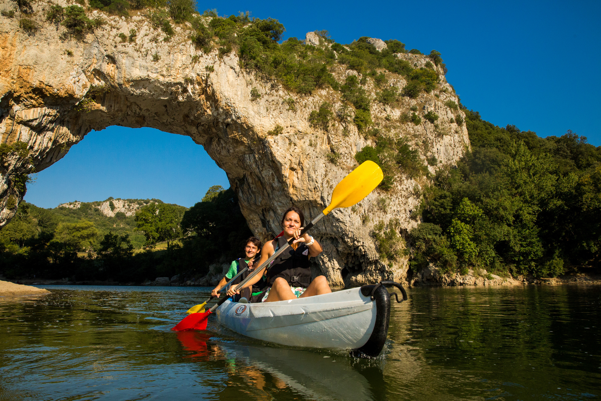 Il aura fallu des millions d'années pour que l'Ardèche creuse un vertigineux canyon dans les falaises calcaires abruptes s'étendant sur une trentaine de kilomètres entre Vallon Pont d'Arc et Saint Martin d'Ardèche. Ce territoire est classé Réserve Naturelle. La porte d'entrée en est le majestueux Pont d'Arc, arche qui surplombe la rivière du haut de ses 54 mètres.Les Gorges de l'Ardèche offrent aux amateurs de sport de pleine nature et de paysages grandioses un terrain de jeu exceptionnel. Plusieurs parcours allant de la mini descente de 8 kms à la maxi descente en 3 jours de 60kms sont proposés..
